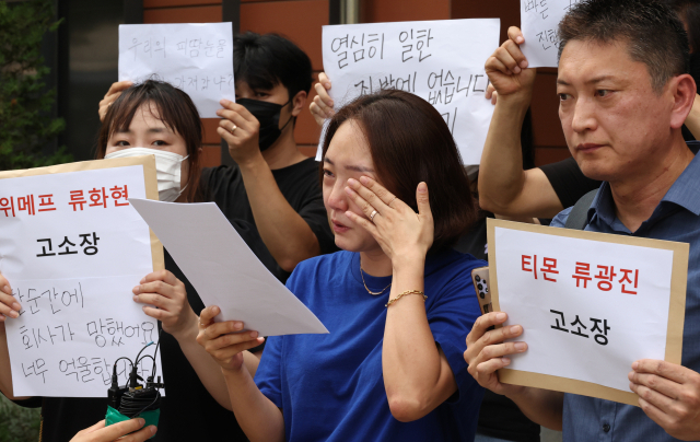 티몬, 위메프 미정산 피해 판매자들이 1일 강남경찰서에서 고소장 제출 기자회견을 하고 있다. 연합뉴스