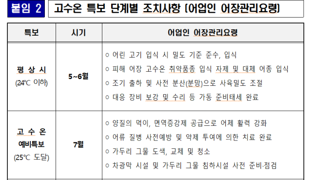 고수온 특보 단계는 ‘고수온 예비특보’(25℃ 도달시)→‘고수온 주의보’(28℃ 도달시)→‘고수온 경보’(수온 28℃ 3일 이상 지속시)로 나뉜다. 고수온 예비특보는 주로 7월에 발령되고, 주의보와 경보는 주로 8월에 발령된다.