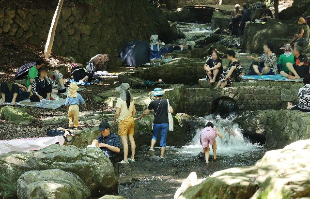 부산을 비롯한 전국에 폭염경보가 지속된 지난달 31일 오후 부산 부산진구 성지곡수원지 아래 계곡을 찾은 시민들이 나무 그늘에서 더위를 식히고 있다. 정종회 기자 jjh@