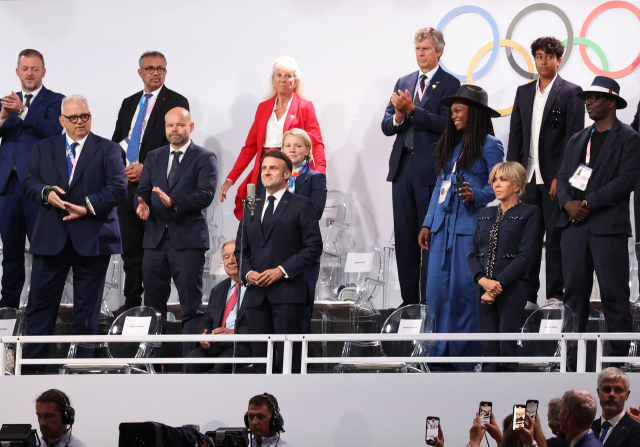 에마뉘엘 마크롱 프랑스 대통령이 2024 파리올림픽 개막일인 지난달 26일(현지시간) 프랑스 파리 트로카데로광장 개회식장에서 대회 개회선언을 하고 있다. 연합뉴스
