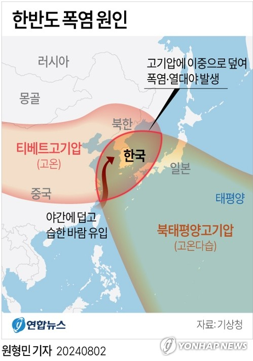 7월 말부터 이어지고 있는 이번 무더위는 한반도 역사상 최악의 무더운 여름으로 꼽히는 2018년과 유사한 상황이다. 2018년과 마찬가지로 티베트 고기압과 북태평양 고기압의 영향으로 고온다습한 공기가 계속해서 유입되고 있다. 마치 한반도가 두터운 이불 2개를 덮고 있는 것 같은 형국으로, 열이 들어오기만 하고 빠져나가지 못하면서 더위가 심화되고 있다.