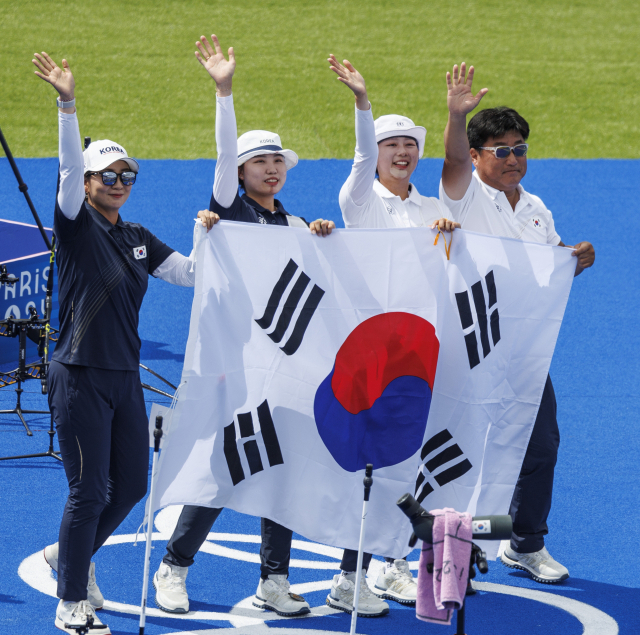 2024 파리 올림픽 양궁 여자 개인전 결승에서 금메달을 수확한 임시현(오른쪽 두 번째)과 은메달을 딴 남수현(오른쪽 세 번째)이 양창훈 감독(오른쪽 첫 번째)과 김문정 코치와 함께 태극기를 들고 인사하고 있다. 연합뉴스