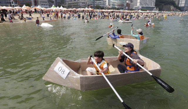 ‘송도해수욕장 종이배 경주대회’가 4일 오후 부산 서구 송도해수욕장에서 열렸다. 참가자들이 골판지와 비닐 등을 이용해 가족과 함께 직접 만든 종이배를 타고 경주를 하고 있다.