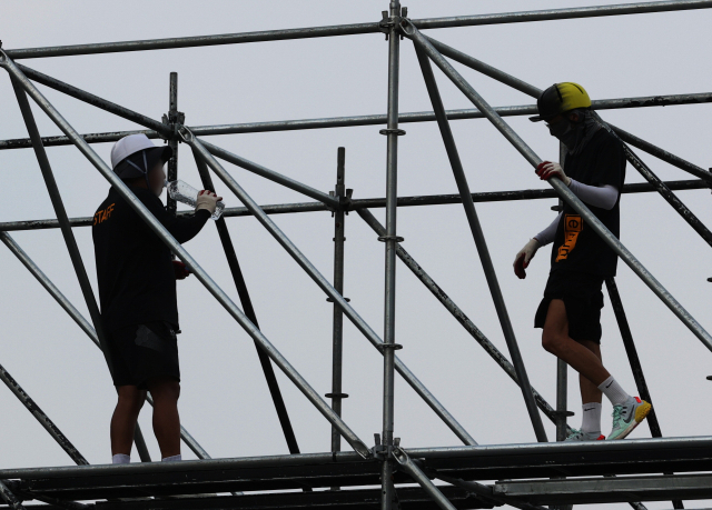 지난달 집중 호우 이후 폭염이 지속되면서 고금리·고물가·고환율 등에 시달리던 지역 건설업계의 어려움이 가중되고 있다. 지난해 8월 서울의 한 공사 현장에서 근로자들이 물을 마시고 있다. 연합뉴스