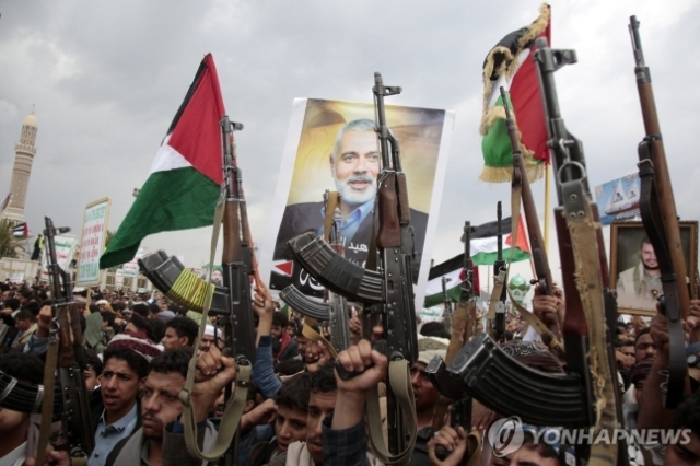 2일 예멘 사나에서 후티 반군 지지자들이 숨진 무장정파 하마스 최고 정치지도자 이스마일 하니예의 사진을 들고 있다. EPA 연합뉴스