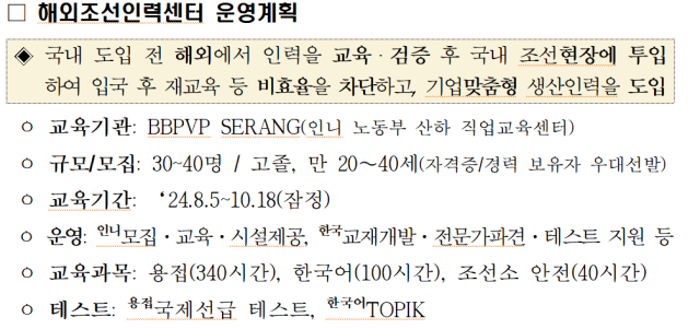 ‘해외조선인력센터’는 의사소통을 위한 한국어 교육과 우리 조선현장 특성에 맞는 기술교육을 현지에서 사전에 실행함으로써 국내에서 재교육할 필요 없이 조선현장에 즉시 투입하고, 안정적 우수인력 공급 채널을 구축하는 한편, 현지 국가와의 산업협력을 강화하려는 취지로 기획됐다.