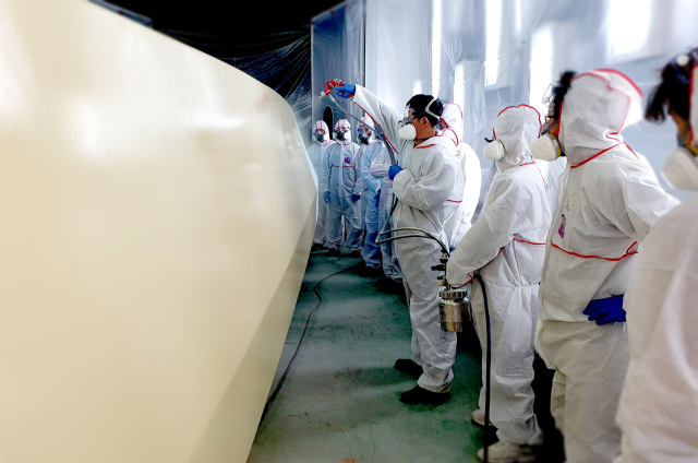 국내에서 운영하는 ‘조선업 생산기술 인력양성 과정’에 참여한 교육생들이 도장 실습을 하고 있다. 중소조선연구원 제공