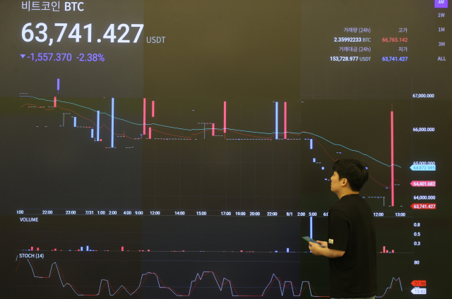 지난 1일 오후 서울 강남구 업비트 라운지 전광판에 비트코인 시세가 표시되고 있다. 가상화폐 대장주 비트코인 가격이 6만5천 달러선 아래로 떨어지며 약세를 보이고 있다. 제롬 파월 미 연방준비제도(Fed·연준) 의장이 9월 금리인하 가능성을 열어두면서도 신중함을 나타낸 데 따른 것으로 풀이된다. 연합뉴스