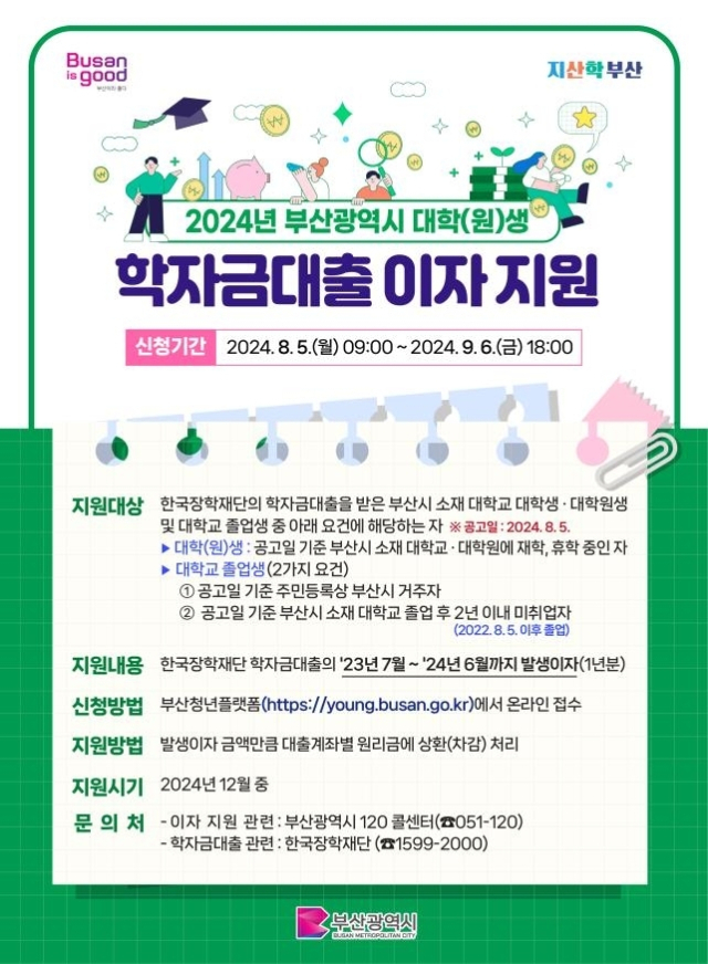 부산시가 ‘2024년 부산시 대학(원)생 학자금대출 이자지원 사업’ 신청자를 모집한다.