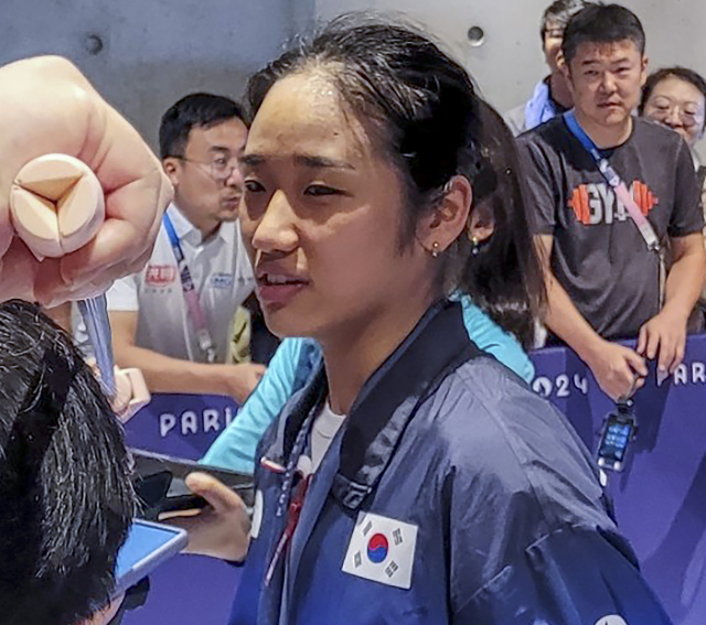 5일(현지시간) 프랑스 파리 포르트드 라 샤펠 아레나에서 열린 2024 파리올림픽 배드민턴 여자 단식 결승전에서 승리해 금메달을 획득한 안세영이 시상식을 마친 뒤 믹스드존에서 자신의 부상과 관련한 심경에 대해 인터뷰하고 있다. 연합뉴스