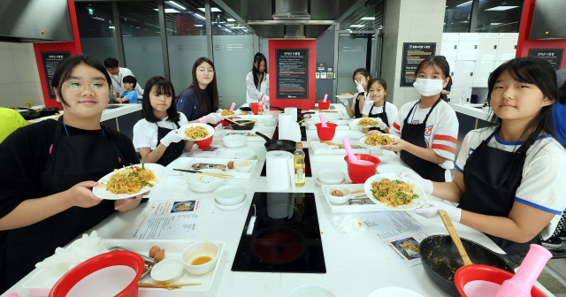 6일 부산 해운대구 KF아세안문화원에서 진행된 ‘GO! 글로벌 학생 캠프’ 참가 학생들이 직접 만든 태국 음식인 팟타이를 들어보이고 있다. 정종회 기자 jjh@