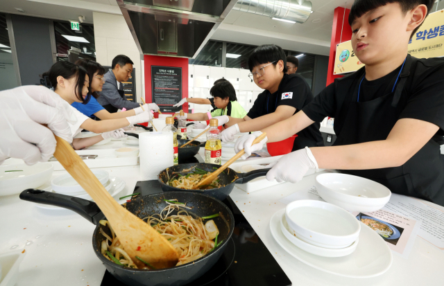 6일 부산 해운대구 KF아세안문화원에서 진행된 ‘GO! 글로벌 학생 캠프’ 참가 학생들이 태국 음식인 팟타이를 만들어보고 있다. 정종회 기자 jjh@
