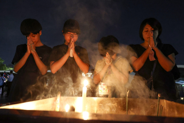 일본 히로시마 원자폭탄 투하 79주년인 6일 히로시마 평화공원을 찾은 현지 주민들이 원폭 희생자들을 추모하고 있다. AFP연합뉴스