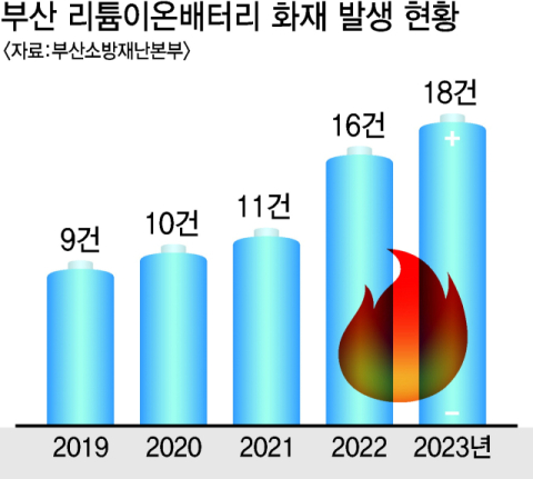 6일 부산소방재난본부에 따르면 2019~2023년 부산에서 2차전지인 리튬이온 배터리 화재는 모두 64건이 발생했다. 특히 매년 꾸준히 증가하는 추세다. 리튬이온 배터리 화재는 2019년 9건이었으나 2023년에는 18건으로 늘었다. 리튬이온 배터리는 전기차, 전기자전거, 전동킥보드 그리고 노트북 같은 전자기기 등 여러 제품군에 광범위하게 쓰인다.