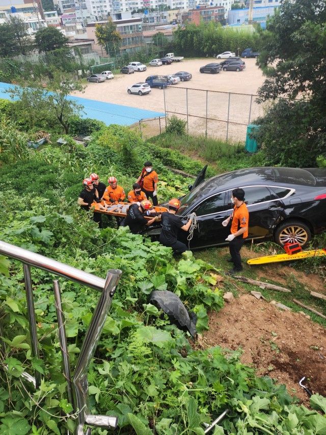 부산 사하구서 경사로 주행하던 차 2m 아래로 추락… 2명 부상
