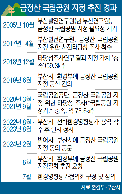 부산 6개 지자체(금정·동래·사상·부산진·북·연제구)와 경남 양산에 걸친 73.645㎢ 일대를 국가가 관리하는 국립공원으로 지정하기 위한 행정절차가 착착 진행되고 있는 셈이다. 전략환경영향평가 항목이 확정되면 환경부가 평가를 진행한다.