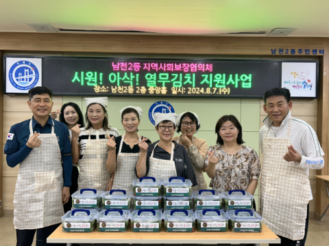 남천2동 지역사회보장협의체(위원장 배귀선)가 주최한 이 행사에서는 관내 저소득 가정을 위해 회원들이 열무김치를 직접 담가 해당 가정을 방문하여 전달하며 이웃 간의 훈훈한 정을 나누었다.
