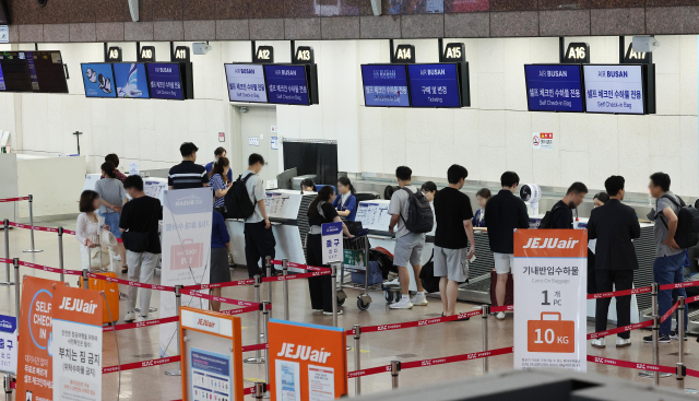 대형 항공사들이 김해국제공항에 투자를 꺼리면서 부산 관광·마이스 산업의 경쟁력이 떨어질 것이라는 우려가 나온다. 12일 오후 김해국제공항 국내선 청사에서 이용객들이 저비용 항공사 탑승 수속을 하고 있다. 정종회 기자 jjh@