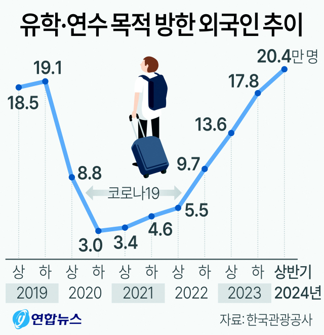 유학·연수 목적의 방한 외국인은 꾸준히 증가해 코로나19 직전인 2019년 하반기 19만 1000명까지 늘었다가 이듬해 하반기 3만 명까지 줄었다. 이후 회복세를 보여 지난해 하반기 17만 8000명으로 늘었다.