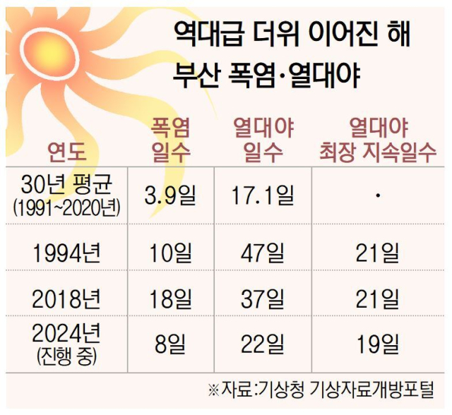 역대급 더위를 보인 1994년과 2018년과 비교했을 때 올여름 더위는 폭염보다 열대야가 심각하다는 점이다. 기상청 기상자료개방포털에 따르면 올해 부산의 폭염(일 최고기온 33도 이상)일은 8일에 불과했다. 1994년의 10일, 2018년의 18일에 비하면 한참 못 미친다.
