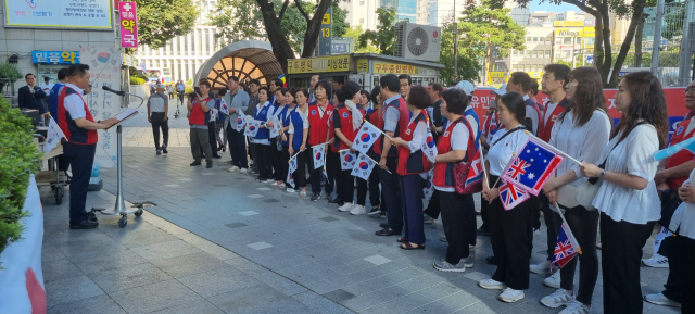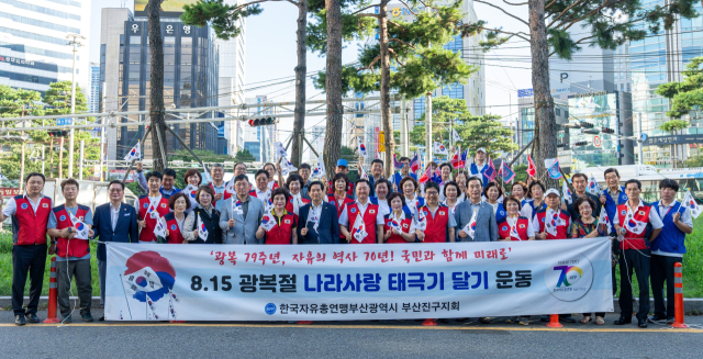 한국자유총연맹 부산진구지회(회장 노학양)는 8·15 광복절을 앞두고 13일 ‘광복 79주년, 자유의 역사 70년! 나라사랑 태극기 달기 운동’ 캠페인을 벌였다.