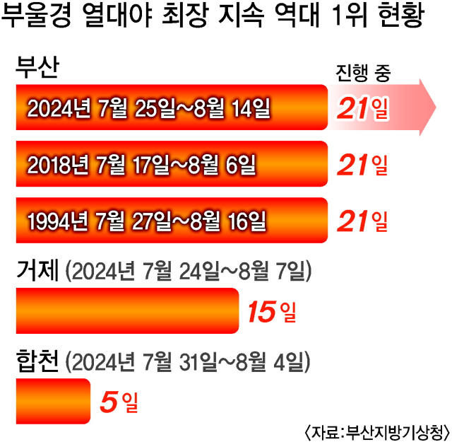 부산 열대야 최장 지속 기록이 깨졌다. 지난 14일까지 밤 최저기온이 25도 이하로 떨어지지 않는 열대야가 21일째 지속돼, 1904년 부산에서 기상 관측을 시작한 이후 가장 길었다.
