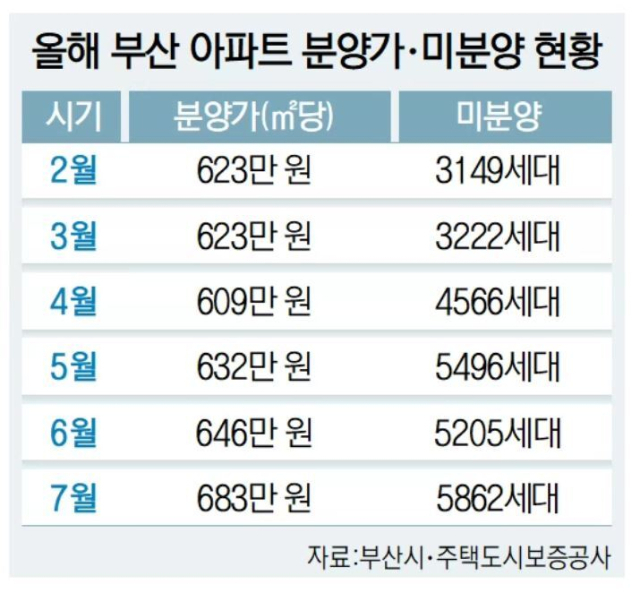 분양가는 천정부지로 치솟는데, 주인을 찾지 못하는 미분양 물량은 쌓여만 간다. 16일 부산시에 따르면 지난달 말 기준 부산의 미분양 아파트는 5862세대로 6월 말 기준 미분양 아파트(5205세대)에 비해 12.6% 증가했다.