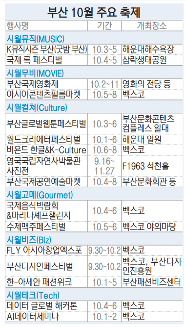 부산시는 올해 처음으로 시도하는 부산형 융복합 전시컨벤션 ‘페스티벌 시월’을 다음 달 30일부터 10월 8일까지 9일간 시 전역에서 개최한다고 19일 밝혔다. 페스티벌 기간에는 6개 분야(뮤직·무비·컬처·고메·비즈·테크) 17개의 국제행사가 열린다. 부산국제영화제를 비롯해 부산국제록페스티벌, 부산글로벌웹툰페스티벌, 수제맥주페스티벌, 아시아창업엑스포 등이 진행될 예정이다.
