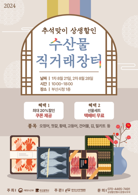 '추석맞이 상생할인 수산물 직거래장터'는 해양수산부와 부산광역시 주최, 한국수산무역협회가 주관하는 행사로 2주간 매주 수요일(8월 21일,28일) 10시부터 18시까지 부산시청 1층 로비에서 운영될 예정이다.