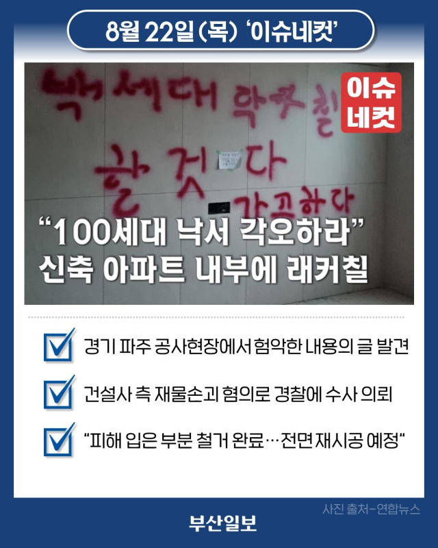 경기도 파주 운정신도시의 한 신축 아파트 건설현장에서 현장 근로자가 쓴 것으로 추정되는 험악한 내용의 낙서가 발견됐습니다. 현재 피해가 확인된 집은 1세대인데요. 내부 거실 벽면 아트월 타일과 창문 유리 등 곳곳에 서툰 한국말로 '100세대 락카칠 할 것다(100세대 래커칠 할 것이다), 가고하라(각오하라)"는 등의 문구를 비롯한 경고문과 욕설을 붉은색의 래커로 칠했습니다. 건설사 측은 피해가 심각하다고 보고 재물손괴 혐의로 경찰에 수사를 의뢰하기로 한 가운데, 건설사 관계자는 "해당 세대의 망가진 부분은 현재 철거가 이뤄졌으며, 이후 전면 재시공할 예정"이라며 "내년 입주하는 세대에는 피해가 없을 것"이라고 밝혔습니다.