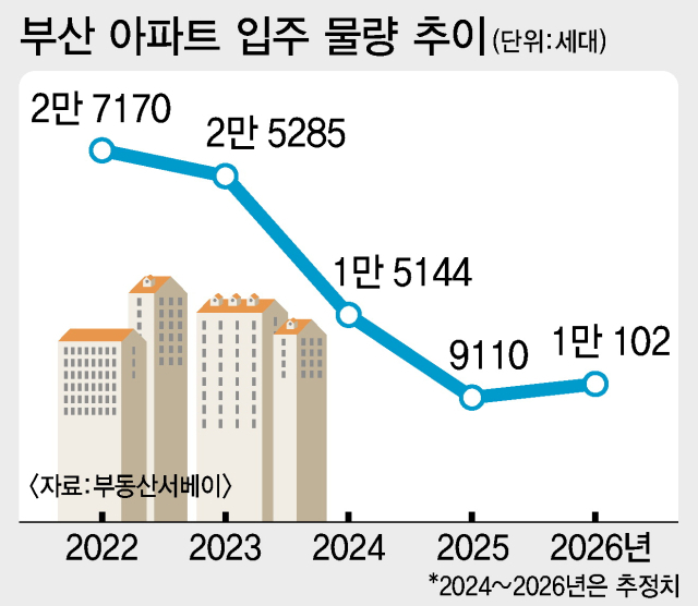 내년 부산 지역 신축 아파트 입주 물량이 16년 만에 최저치를 기록하며 바닥을 칠 전망이다. 공급 부족에 금리 인하에 대한 기대감마저 겹치면 부동산 시장이 요동칠 수 있기에 정부와 지자체가 지금부터 적정 물량 공급에 나서야 한다는 지적이다.