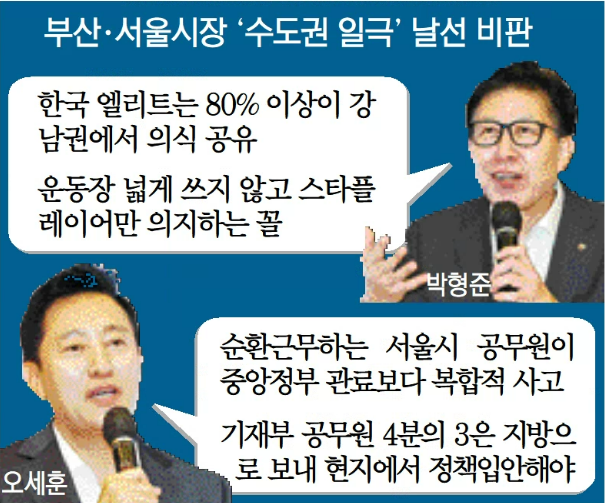 한국정치학회가 마련한 지난 23일 특별 대담에서 박형준 부산시장과 오세훈 서울시장은 균형발전에 손 놓고 있는 중앙정부를 연신 질타했다. 박 시장은 인서울의 벽에 가로막힌 지역 지자체장의 울분을 토했고, 오 시장은 부처 이기주의에 빠진 관료들의 안일함을 비꼬았다.