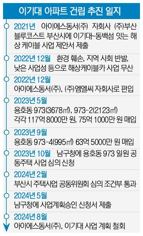 아이에스동서가 이기대 입구 부지에 고층 아파트를 개발하겠다는 방침을 세운 것은 이기대~동백섬을 잇는 해상 케이블카 사업이 무산된 이후다. 앞서 아이에스동서는 자회사 (주)부산불루코스트를 통해 2021년 이기대와 동백섬을 잇는 해상 케이블카 사업을 추진했다. 강한 추진 의사를 갖고 전방위로 뛰던 아이에스동서는 환경 훼손 논란과 낮은 사업성 등에 부딪히자 2022년 말 눈물을 머금고 결국 해상 케이블카 사업을 접어야 했다.