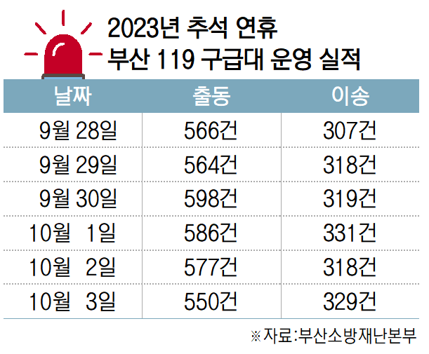추석 연휴를 앞두고 응급실 공백을 둘러싼 우려는 더 커지고 있다. 통상 추석 연휴에는 일반 병원들이 문을 닫아 응급실 환자가 배로 늘어난다. 이날 보건복지부에 따르면 2022년 추석 연휴 전국 권역·지역응급의료센터 166곳의 환자 내원 건수는 약 9만 건으로, 이는 평소보다 1.9배가량 늘어난 수치다. 부산에서도 추석 연휴 소방 출동은 평소보다 늘어난다. 이날 부산소방재난본부에 따르면 지난해 추석 연휴 6일간 하루 평균 출동 건수는 538건으로 평소 일평균 출동 건수 573건에 비해 6.5% 증가한 것으로 드러났다.