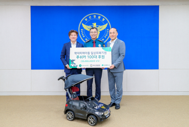 부산경찰청(청장 김수환)은 30일 (주)파파야나인(대표 정태엽), 초록우산(부산지역본부장 김희석)과 학대 피해 아동 일상 회복 지원을 위해 경찰 엠블럼이 부착된 푸쉬카 전달식을 가졌다.