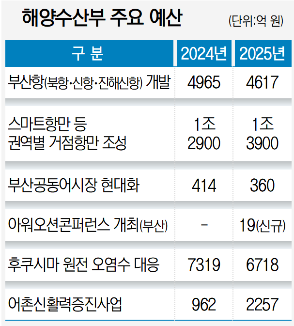 부산항 진해신항과 광양항 자동화 테스트베드(시험대) 등 스마트 항만 조성에는 올해보다 1000억 원 증액한 1조 3900억 원이 투입된다. 부산공동어시장(360억 원), 통영 거점 위판장(29억 원), 제주 거점 위판장(5억 원) 등 노후화된 위판장 현대화 예산도 배정됐다.