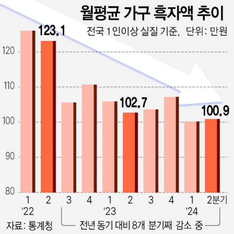 가계 흑자액은 2022년 3분기부터 8개 분기째 줄고 있다. 2006년 1인 가구를 포함해 가계 동향이 공표된 뒤로 역대 최장기간 감소다.