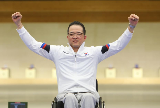 장애인 사격 박진호가 3일(현지시간) 프랑스 샤토루 슈팅센터에서 열린 사격 R7 남자 50m 소총 3자세(스포츠등급 SH1) 결선에서 우승해 2관왕에 오른 뒤 시상식에서 두 주먹을 불끈 쥐고 있다. 연합뉴스