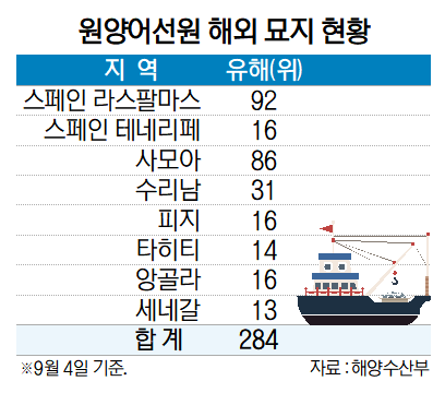 해양수산부는 남태평양 섬나라 사모아와 프랑스령 폴리네시아의 섬 타히티 묘역에 안치돼 있던 우리나라 원양어선원 유해 2위를 국내로 이장한다고 4일 밝혔다.