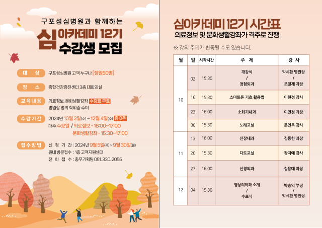 심아카데미 12기는 10월 2일부터 12월 4일까지 매주 수요일에 총 8주 과정으로 의료 정보와 문화생활 강좌가 번갈아 진행된다.
