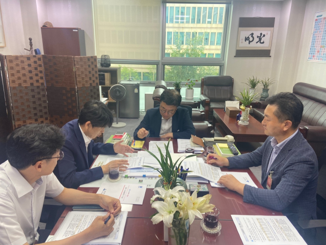 국회 국토교통위원회 소속 국민의힘 서범수 의원(울산 울주군)은 지난 6일 국회의원 회관 사무실에서 국토교통부 국토정책관과 울산시 도시균형개발 국장으로부터울산 도심융합특구 진행 상황을 보고받고, 완공까지 속도감 있게 추진해 줄 것을 당부했다. 서범수 의원실 제공.