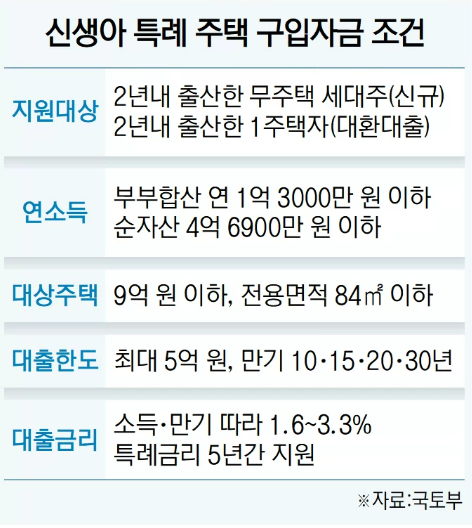신생아 특례대출은 대출 신청일 기준으로 2년 이내에 출산·입양한 무주택 가구나 1주택 가구(대환 대출)를 대상으로 한다. 저금리로 최대 5억원까지 주택 구입 자금을 대출해주는 제도다. 가격 9억원 이하, 전용면적 85㎡ 이하가 대상 주택이다.