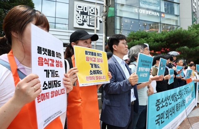 지난 7월 15일 서울 송파구 우아한형제들 본사 앞에서 라이더유니온, 공정한플랫폼을위한사장님모임, 서비스연맹 배달플랫폼노조 관계자 등이 배달의민족 수수료 인상 규탄 및 철회 촉구 기자회견을 하고 있다. 연합뉴스