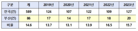 최근 5년간(’19~’23) 전국적으로 휴대용가스렌지와 관련된 화재는 총 589건(연평균 117.8건)으로 인명 175명(사망 13명, 부상 162명), 재산 35억 6천만원의 피해가 매년 발생하고 있다.