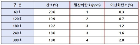 ①실험결과 실험용기(60x30x50cm) 안에서 가스를 누설하였을 경우 약 360초 경과했을 때 일산화탄소 4ppm, 이산화탄소 2.0%, 산소 18%로 측정됐다. 산소농도는 낮아지는 대신 일산화탄소와 이산화탄소 농도는 높아졌다. 만약 좁은 공간에서 장시간 가스가 누설될 경우 이로 인하여 질식할 가능성이 상당히 높다(아래표 참조).