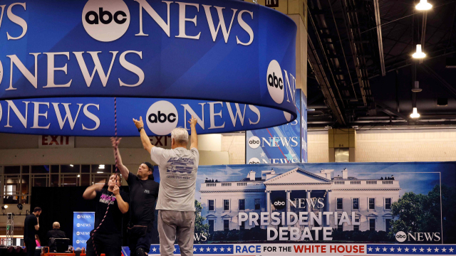 미국 대선주자인 민주당 카멀라 해리스 부통령과 공화당 도널드 트럼프 전 대통령의 첫 TV토론을 하루 앞둔 9일(현지시간) 펜실베이니아주 필라델피아 컨벤션 센터 안 미디어룸에 토론회 주관사인 ABC 뉴스 간판이 설치되고 있다. AFP연합뉴스