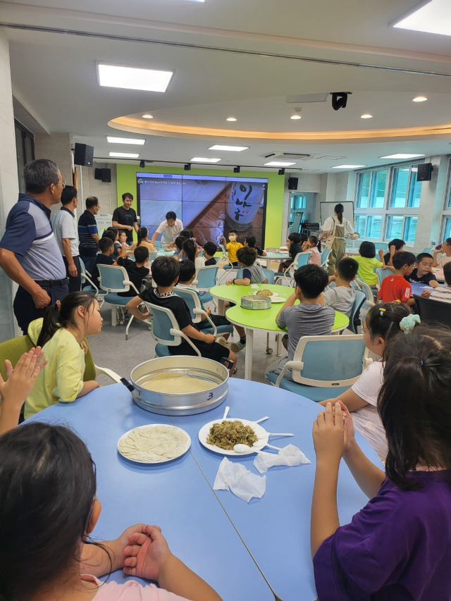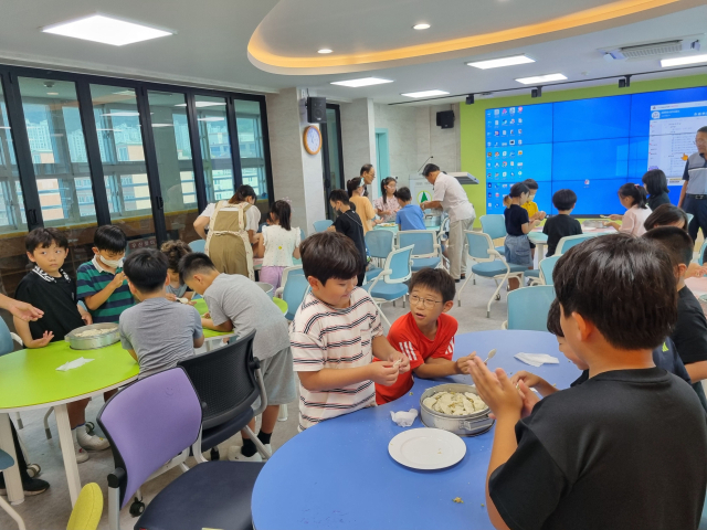 경남 양산시 양산초등학교 2학년생 50여 명이 11일 중앙동 건강관리위원회가 추석을 맞아 마련한 만두 만들기 체험을 하면서 즐거운 시간을 보내고 있다. 양산시 중앙동 행정복지센터 제공