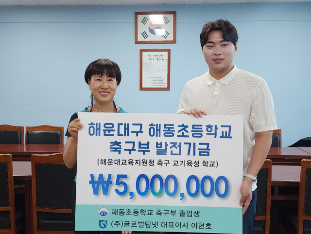 글로벌탑넷 이현호 대표가 자신의 모교인 해동초등학교 축구부에 발전기금을 전달했다.