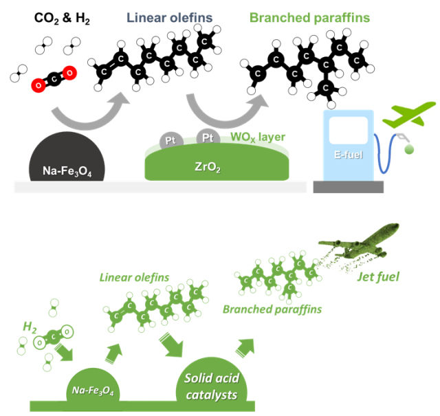 그림. 철 촉매 및 산 촉매 기반의 이산화탄소 직접수소화 반응을 통한 지속가능한 항공유 생산 공정. UNIST 제공