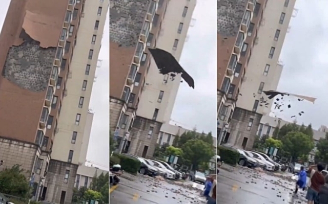 제13호 태풍 ‘버빙카’(BEBINCA)의 영향으로 건물 외벽이 종잇장처럼 뜯겨 날아가는 모습. X(옛 트위터)
